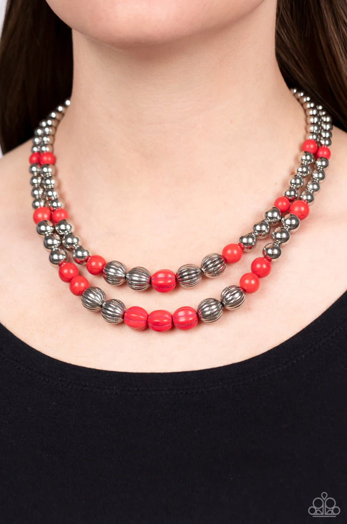 Gradually increasing in size, an earthy series of shiny silver beads, fiery red stones, and faux red stone accents are threaded along invisible wires below the collar, resulting in a rustic layered look. Features an adjustable clasp closure.