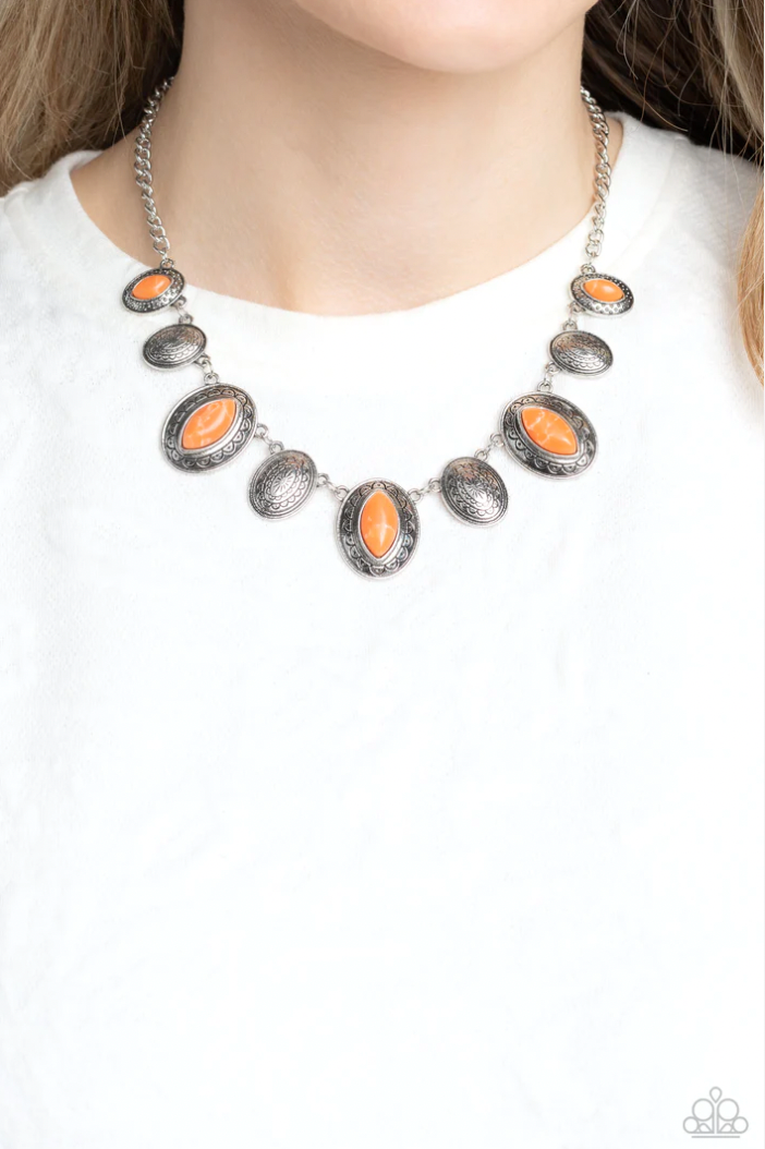 Silver oval discs in varying sizes are inscribed with earthy patterns and studs as they coalesce around the collar on a classic silver chain. Pressed into every other disc, a marquise-chiseled orange stone glimmers for an elemental pop of color amongst the stamped detailing. Features an adjustable clasp closure. As the stone elements in this piece are natural, some color variation is normal.
