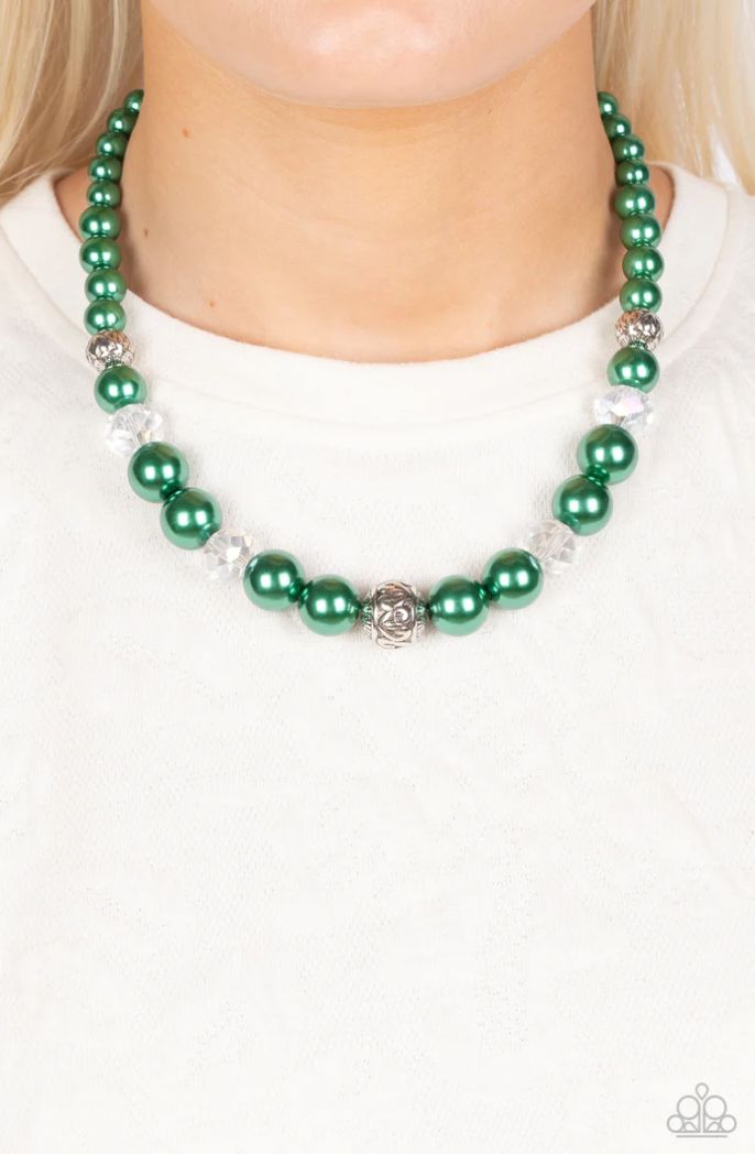Bubbly Spearmint pearls, silver antique-detailed balls, and reflective beads nobly drape around the collar for a refined pop of color. Features an adjustable clasp closure.