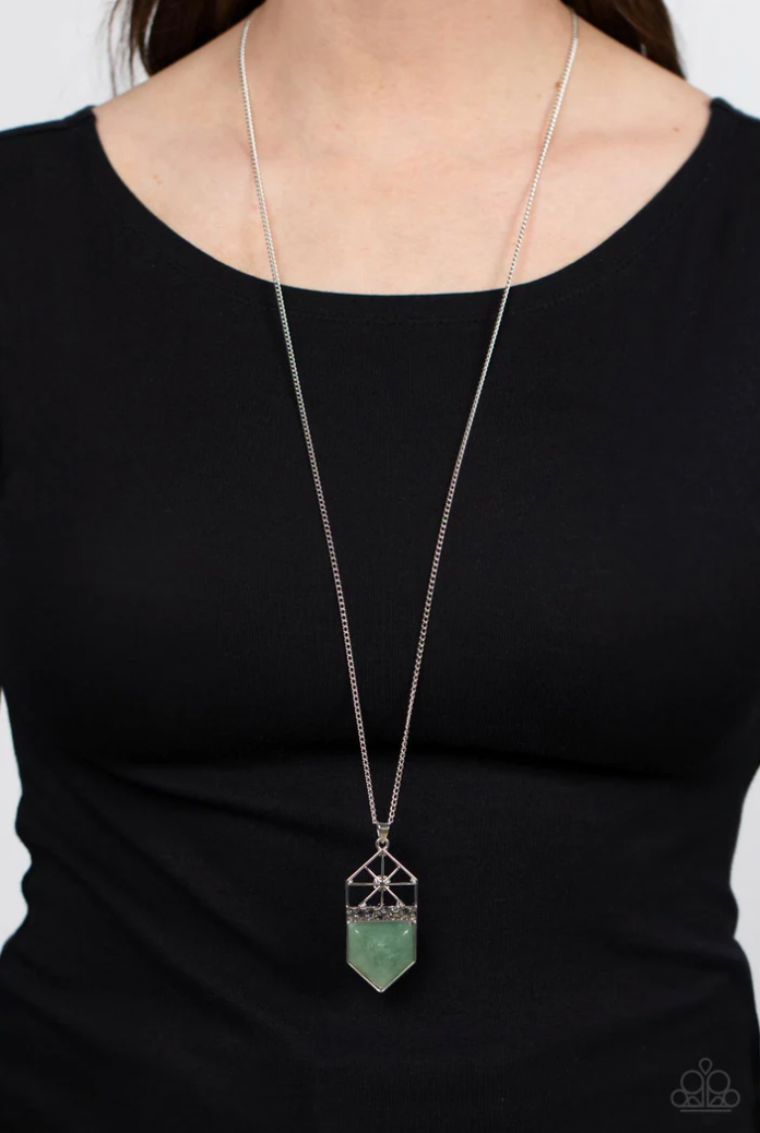 This lucky charm features a polished jade stone that lies below a hammered silver metal bar and a shiny silver starburst top. The earthy pendant swings from the bottom of a lengthened silver chain, resulting in a free-spirited fashion. Features an adjustable clasp closure. As the stone elements in this piece are natural, some color variation is normal.