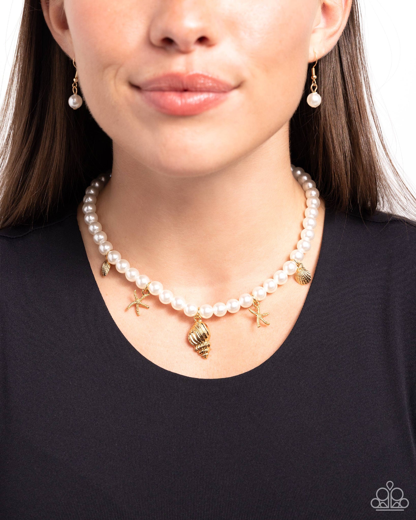 Infused along a strand of bubbly white pearls, a collection of various tactile, gold seashell and starfish charms glitter along the neckline for a beachy bombshell look. Features an adjustable clasp closure.