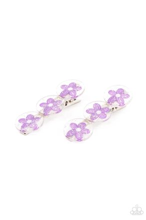 Sprinkled in silvery sparkles, trios of purple flower adorned acrylic discs join into a whimsical pair of hair clips. Features standard hair clips on the back.
